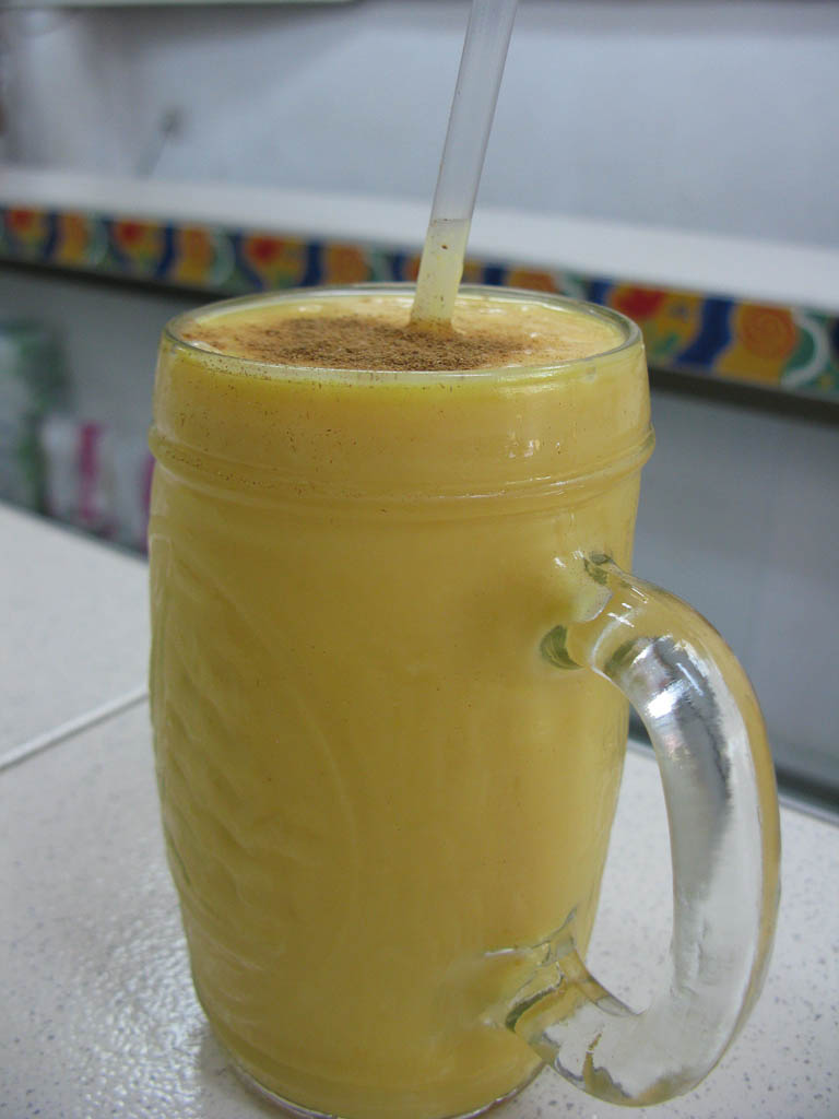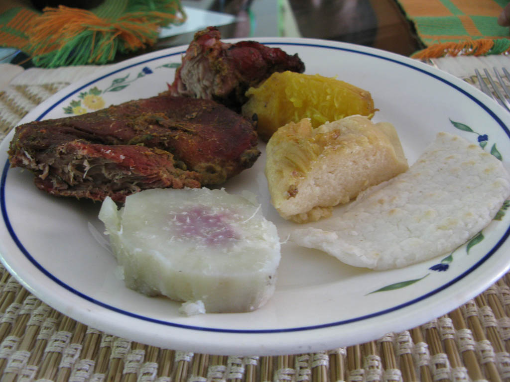 A special meal for a special event. This is Asado Huilense – pork cooked in an adobo of herbs and beer. The drink is sevillana, an egg-based creation with a sprinkling of nutmeg or cinnamon on top.