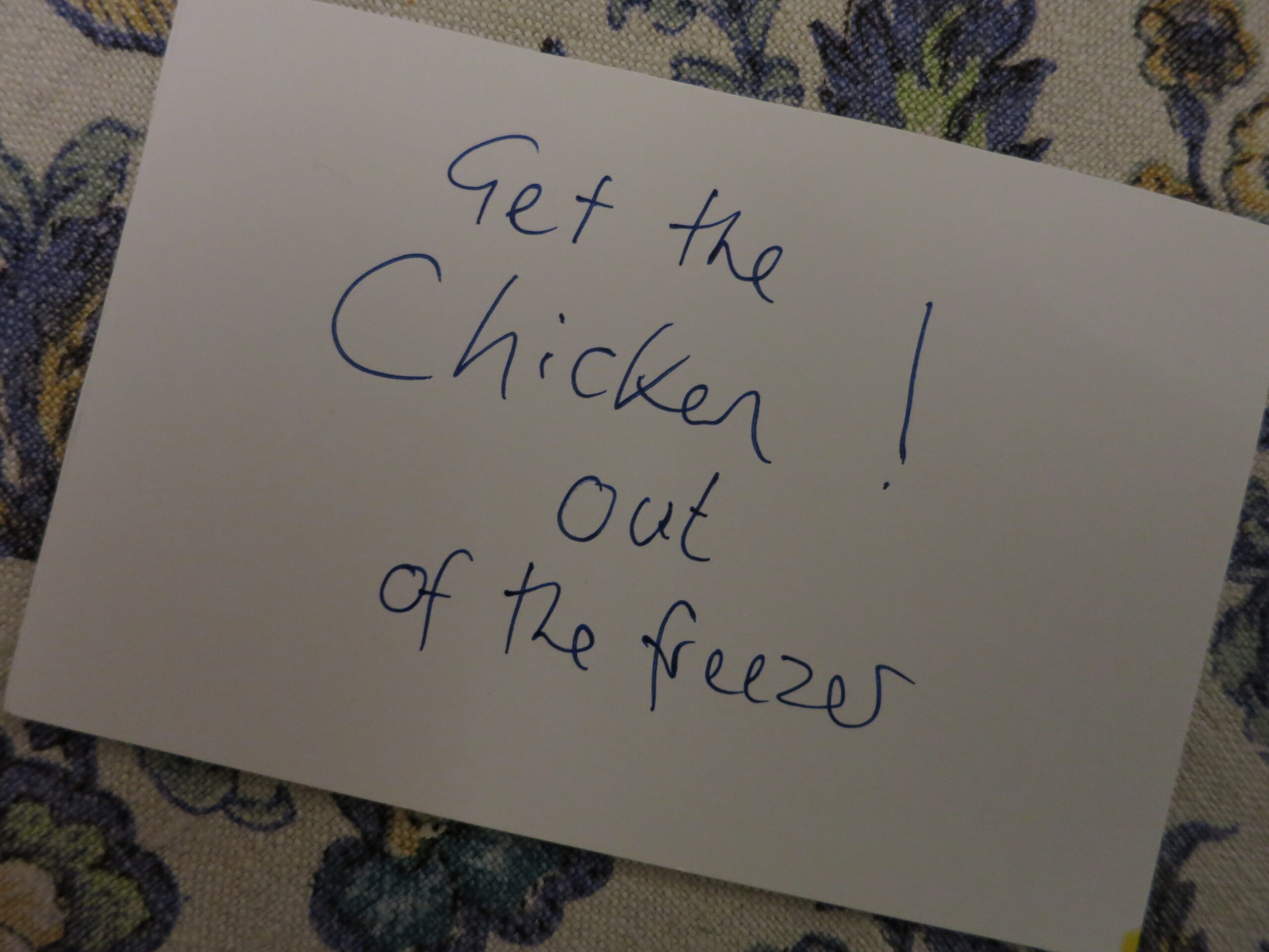 Then it clicked – I was reminding myself to get the chicken out of the freezer. I picked up a pen and made a small addition, so as not to make the same mistake again.