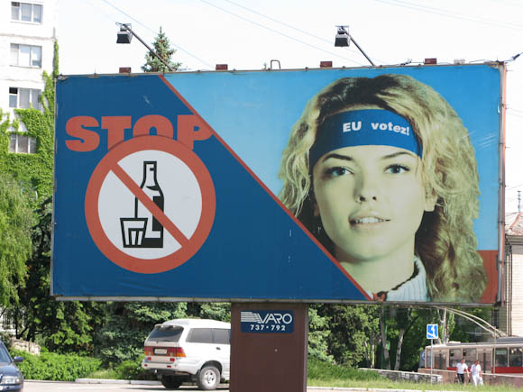 I think the gist of this billboard is that you’re not meant to drink if you’re voting. ‘EU votez’ means ‘I vote’.
