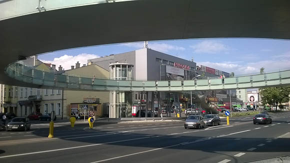 I don’t know exactly what to call it (let’s go for ‘pedestrian roundabout walkway in the sky’) but it’s great. It means you don’t have to suffer the traditional wait-for-half-an-hour-for-the-lights-to-change-then-leg-it-across that you often get on Polish pedestrian crossings.