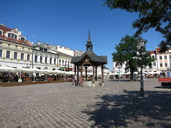 In general, Polish cities are split between the ones with a market square (rynek) for a centre (like Krakow and Wroclaw) and those with a main street (like Gdansk and Lodz). Rzeszow goes for the square, with a rectangular rynek that crests a rise, with a town hall at one end.